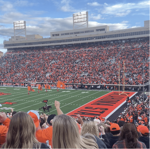 Boone Pickens Stadium packed with thousands of screaming fans decked out in Oklahoma State orange and black. Shoulder to shoulder, collective excitement or disappointment rolling through after each play. Music from the band, keys shaking before kickoff, high-priced concession food, and awful weather can all be found while watching Oklahoma State football play at home.