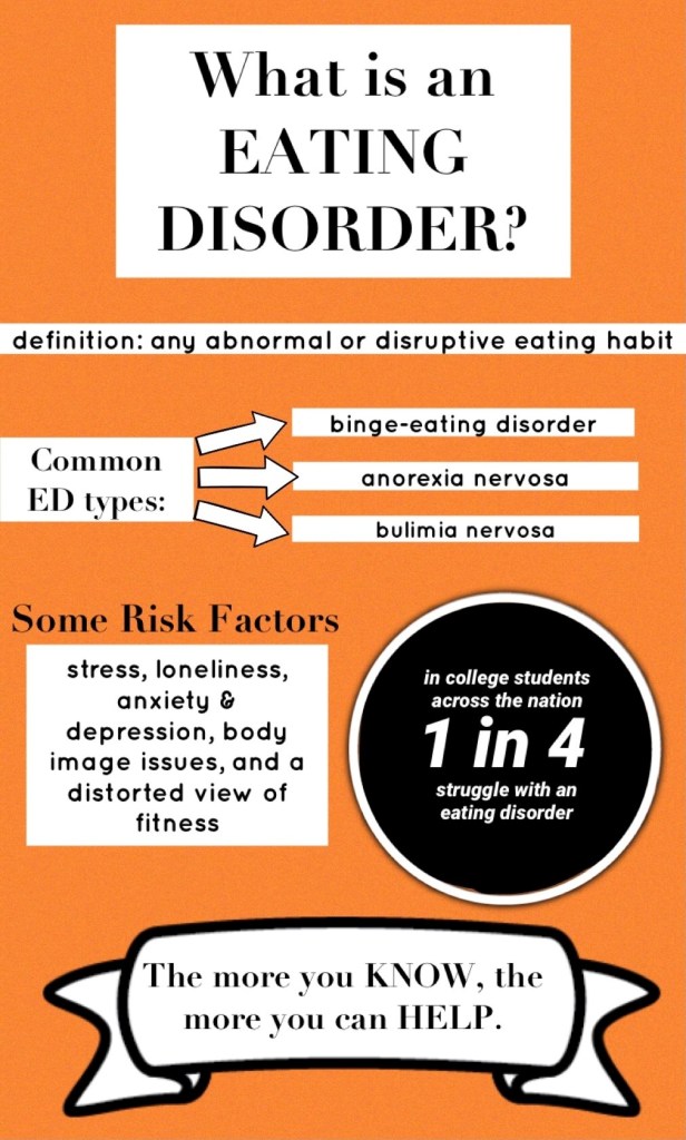 It is often said that you never know what someone else might be going through. This common phrase can especially be applied to people that have developed eating disorders. Most people think that an eating disorder is defined by the three most known types: binge-eating disorder (BED), anorexia nervosa (AN) and bulimia nervosa (BN) (Ellis et al.). However, eating disorders are much more than that. An eating disorder (ED) is simply any abnormal or disruptive eating habit. This includes, not just BED, AN, and BN, but also, avoidant-restrictive food intake disorder (ARFID) (Ellis et al.). Because it is not widely understood, it can sometimes be difficult to spot, and therefore, never confronted. Research has shown that eating disorders within college populations are increasing. As an individual navigates their time spent in college, many factors have the potential to cause them to develop an eating disorder. In order to lessen the number of individuals in college with eating disorders, knowledge of the topic at hand, the presence of it here on Oklahoma State University’s campus, and awareness and resources to help must be addressed.