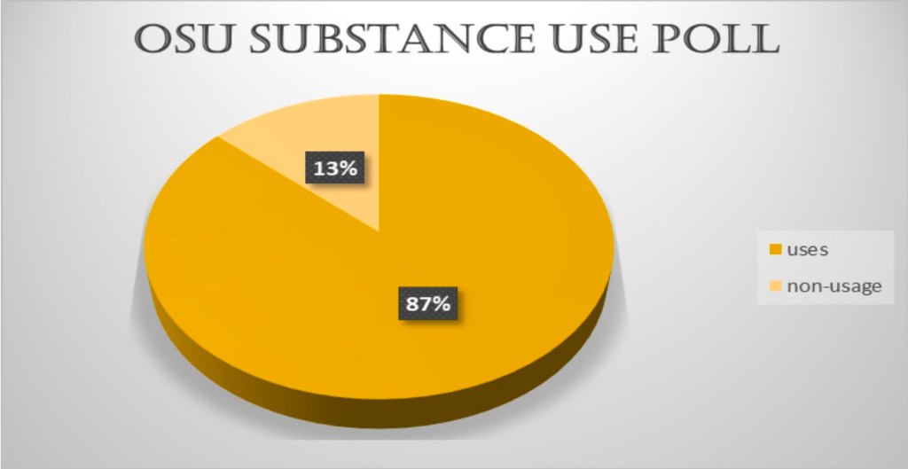 As I researched the topic of alcohol abuse on campus, I conducted a poll based on stress-correlated alcohol usage for the students of the Oklahoma State University class of 2026 platform which has 1,634 users. In this poll, 463 students participated. These were the results. Out of 463 students, 401 (86.8%) said they regularly use alcohol, or other substances as a school-stress management mechanism. While only 62 (13.2%) students said they do not use substances for stress. When looking at this, though it is a small portion of the OSU student body that responded to the poll, it is an alarming statistic for the students who did respond to the poll (Anonymous Student Poll, 2023). These are students who admit to school work being a root cause of their using alcohol to cope which is a very troubling thing to hear from students who are on average 19-20 on this platform.
