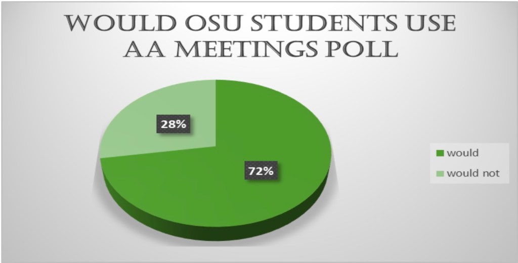 Along with the poll asking if students use alcohol as a coping mechanism, I ran another poll in which 331 students participated. This poll was based on how Oklahoma State University students would feel about real Alcoholics Anonymous meetings being offered on campus as a resource open to all students. In the poll 238 (72%) students said that they would be open to attending Alcoholics Anonymous meetings if they were offered on campus. While 93(28%) students said they would not be open to trying AA meetings (Anonymous student poll, 2023). Once again this is a staggering statistic that adds to the question of why this is not offered, but also never brought up as an option. AA is a researched and proven way of battling alcoholism, that students have shown are more receptive to than other methods. It is a method that allows people to rely on each other in an open and welcoming environment here the power isn’t sided with it being the patient vs the therapist.